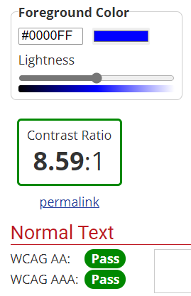 - The colour contrast between the font and background used must be at least WCAG AA compliant. This contrast checker can be used to check if the colours used are compliant. Insert your foreground and background colours into the website, and it will tell you if the contrast fails or passes.